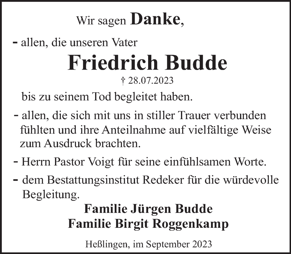 Hier finden Sie alle Traueranzeigen aus der Zeitung, die bisher für Friedrich Budde erschienen sind. Weitere Traueranzeigen, die in der Zeitung erscheinen, werden hier ebenfalls aufgelistet