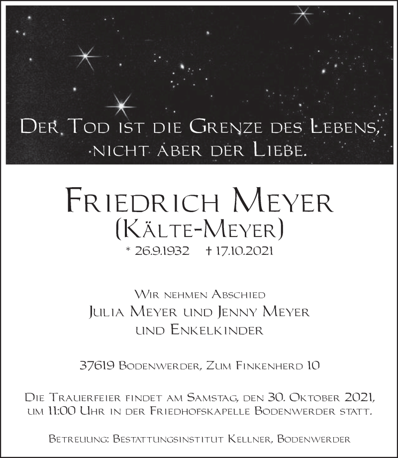Hier finden Sie alle Traueranzeigen aus der Zeitung, die bisher für Friedrich Meyer erschienen sind. Weitere Traueranzeigen, die in der Zeitung erscheinen, werden hier ebenfalls aufgelistet