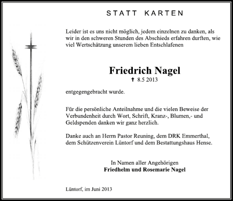 Hier finden Sie alle Traueranzeigen aus der Zeitung, die bisher für Friedrich Nagel erschienen sind. Weitere Traueranzeigen, die in der Zeitung erscheinen, werden hier ebenfalls aufgelistet