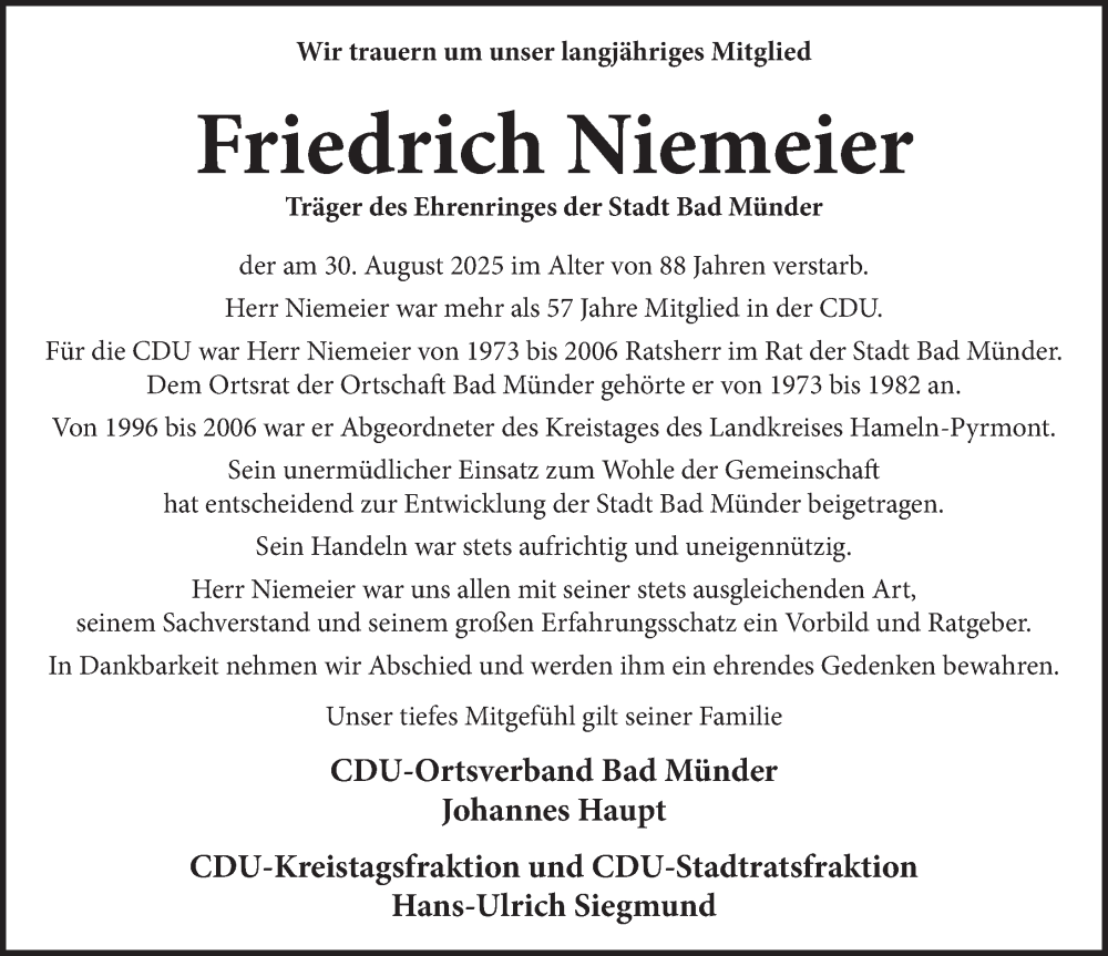 Hier finden Sie alle Traueranzeigen aus der Zeitung, die bisher für Friedrich Niemeier erschienen sind. Weitere Traueranzeigen, die in der Zeitung erscheinen, werden hier ebenfalls aufgelistet