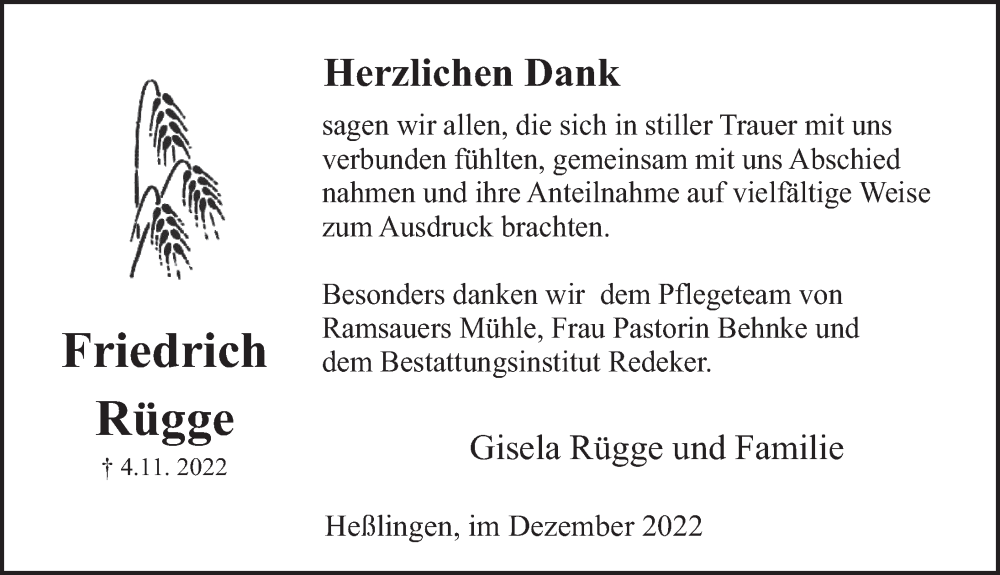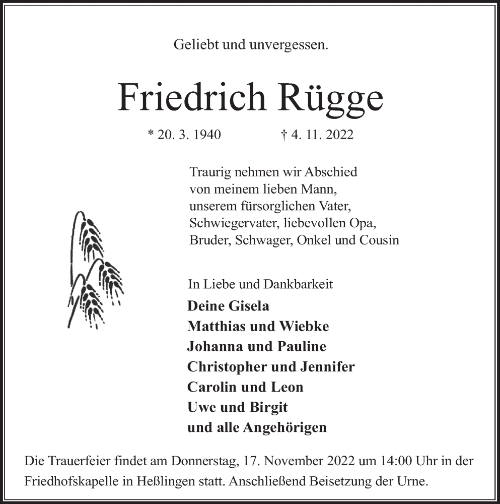 Hier finden Sie alle Traueranzeigen aus der Zeitung, die bisher für Friedrich Rügge erschienen sind. Weitere Traueranzeigen, die in der Zeitung erscheinen, werden hier ebenfalls aufgelistet