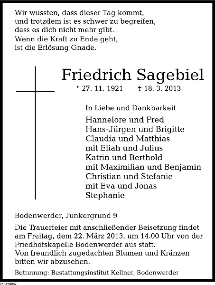 Hier finden Sie alle Traueranzeigen aus der Zeitung, die bisher für Friedrich Sagebiel erschienen sind. Weitere Traueranzeigen, die in der Zeitung erscheinen, werden hier ebenfalls aufgelistet