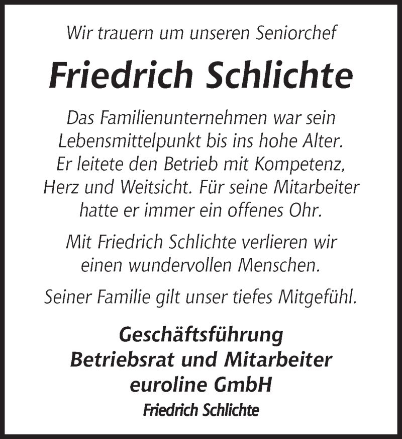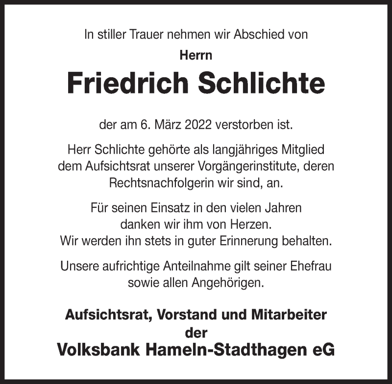 Hier finden Sie alle Traueranzeigen aus der Zeitung, die bisher für Friedrich Schlichte erschienen sind. Weitere Traueranzeigen, die in der Zeitung erscheinen, werden hier ebenfalls aufgelistet