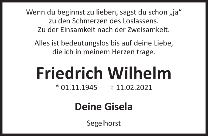 Hier finden Sie alle Traueranzeigen aus der Zeitung, die bisher für Friedrich Wilhelm erschienen sind. Weitere Traueranzeigen, die in der Zeitung erscheinen, werden hier ebenfalls aufgelistet