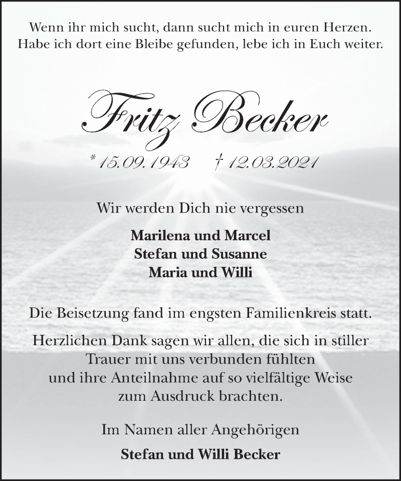 Hier finden Sie alle Traueranzeigen aus der Zeitung, die bisher für Fritz Becker erschienen sind. Weitere Traueranzeigen, die in der Zeitung erscheinen, werden hier ebenfalls aufgelistet