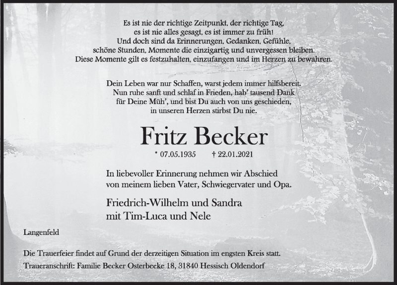 Hier finden Sie alle Traueranzeigen aus der Zeitung, die bisher für Fritz Becker erschienen sind. Weitere Traueranzeigen, die in der Zeitung erscheinen, werden hier ebenfalls aufgelistet