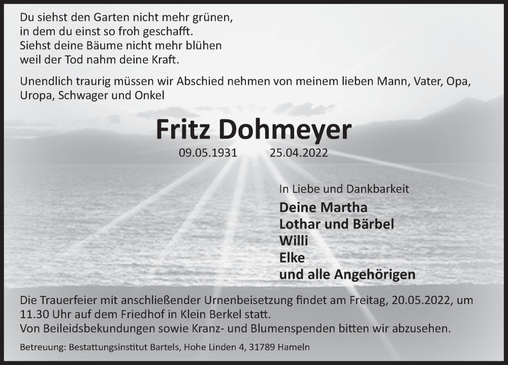 Hier finden Sie alle Traueranzeigen aus der Zeitung, die bisher für Fritz Dohmeyer erschienen sind. Weitere Traueranzeigen, die in der Zeitung erscheinen, werden hier ebenfalls aufgelistet