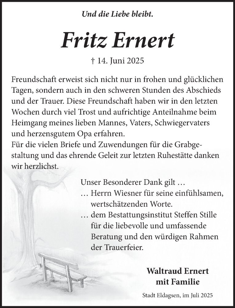 Hier finden Sie alle Traueranzeigen aus der Zeitung, die bisher für Fritz Ernert erschienen sind. Weitere Traueranzeigen, die in der Zeitung erscheinen, werden hier ebenfalls aufgelistet