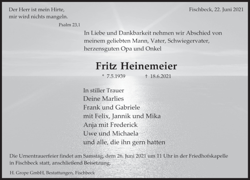 Hier finden Sie alle Traueranzeigen aus der Zeitung, die bisher für Fritz Heinemeier erschienen sind. Weitere Traueranzeigen, die in der Zeitung erscheinen, werden hier ebenfalls aufgelistet