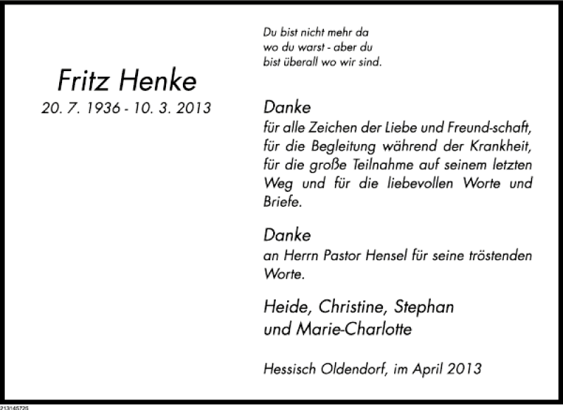 Hier finden Sie alle Traueranzeigen aus der Zeitung, die bisher für Fritz Henke erschienen sind. Weitere Traueranzeigen, die in der Zeitung erscheinen, werden hier ebenfalls aufgelistet
