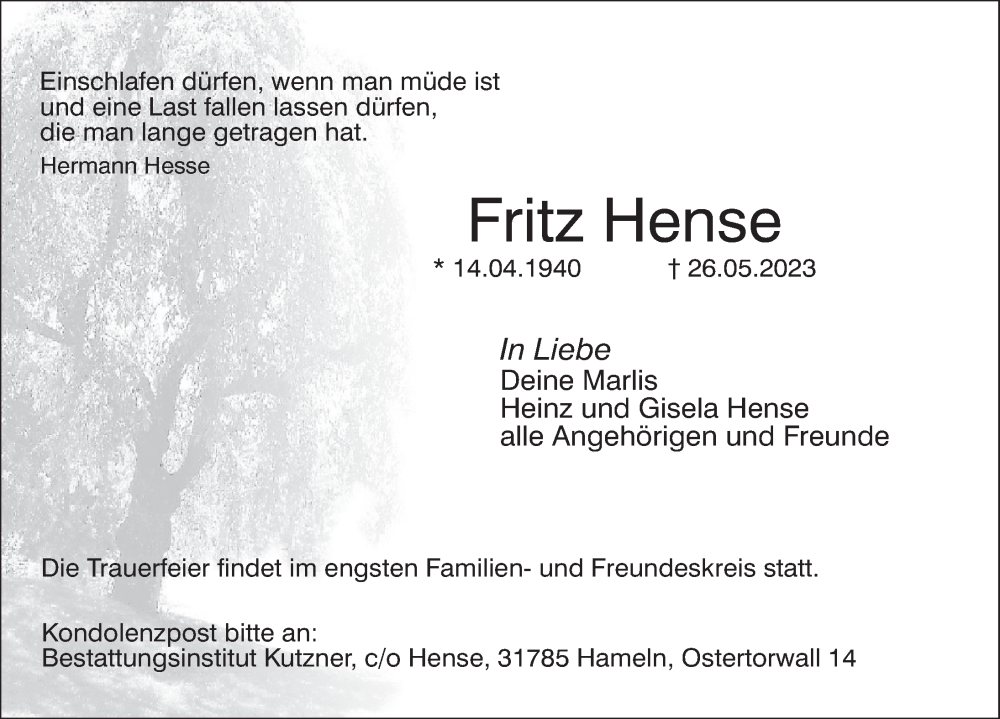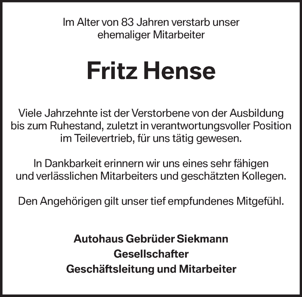 Hier finden Sie alle Traueranzeigen aus der Zeitung, die bisher für Fritz Hense erschienen sind. Weitere Traueranzeigen, die in der Zeitung erscheinen, werden hier ebenfalls aufgelistet