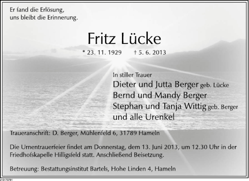 Hier finden Sie alle Traueranzeigen aus der Zeitung, die bisher für Fritz Lücke erschienen sind. Weitere Traueranzeigen, die in der Zeitung erscheinen, werden hier ebenfalls aufgelistet