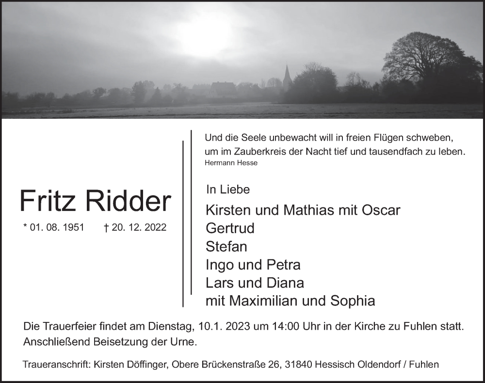 Hier finden Sie alle Traueranzeigen aus der Zeitung, die bisher für Fritz Ridder erschienen sind. Weitere Traueranzeigen, die in der Zeitung erscheinen, werden hier ebenfalls aufgelistet
