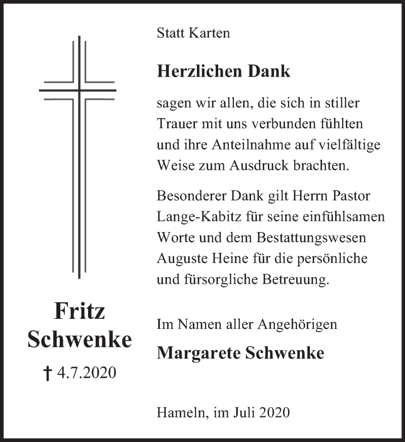 Hier finden Sie alle Traueranzeigen aus der Zeitung, die bisher für Fritz Schwenke erschienen sind. Weitere Traueranzeigen, die in der Zeitung erscheinen, werden hier ebenfalls aufgelistet