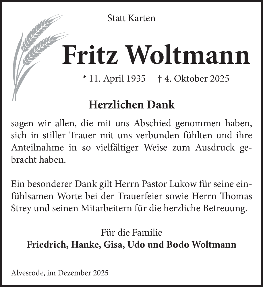 Hier finden Sie alle Traueranzeigen aus der Zeitung, die bisher für Fritz Woltmann erschienen sind. Weitere Traueranzeigen, die in der Zeitung erscheinen, werden hier ebenfalls aufgelistet