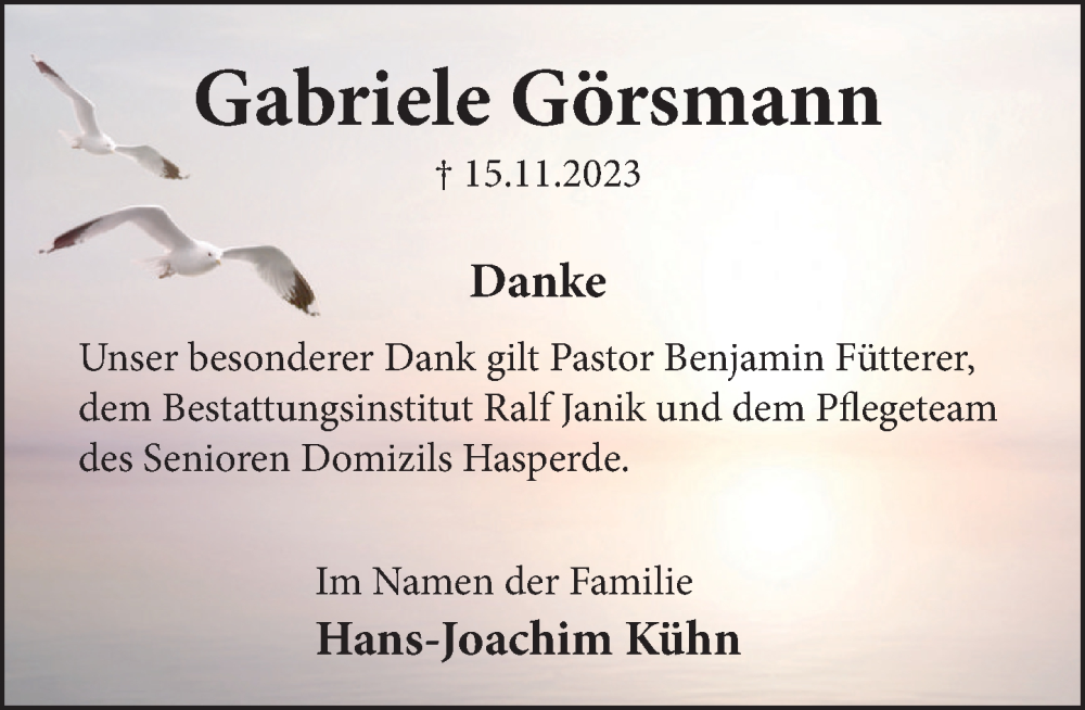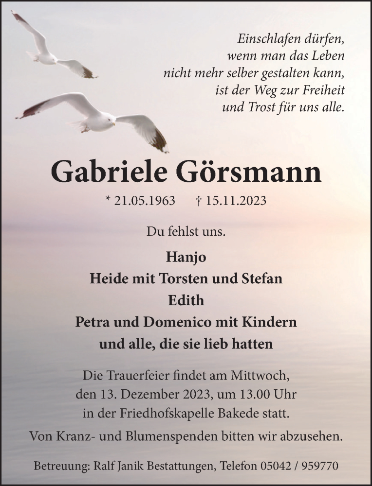 Hier finden Sie alle Traueranzeigen aus der Zeitung, die bisher für Gabriele Görsmann erschienen sind. Weitere Traueranzeigen, die in der Zeitung erscheinen, werden hier ebenfalls aufgelistet