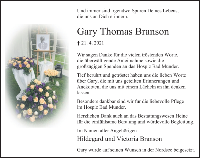 Hier finden Sie alle Traueranzeigen aus der Zeitung, die bisher für Gary Thomas Branson erschienen sind. Weitere Traueranzeigen, die in der Zeitung erscheinen, werden hier ebenfalls aufgelistet
