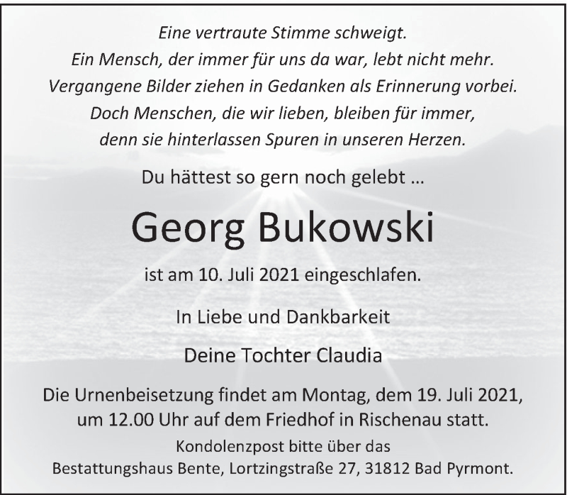 Hier finden Sie alle Traueranzeigen aus der Zeitung, die bisher für Georg Bukowski erschienen sind. Weitere Traueranzeigen, die in der Zeitung erscheinen, werden hier ebenfalls aufgelistet