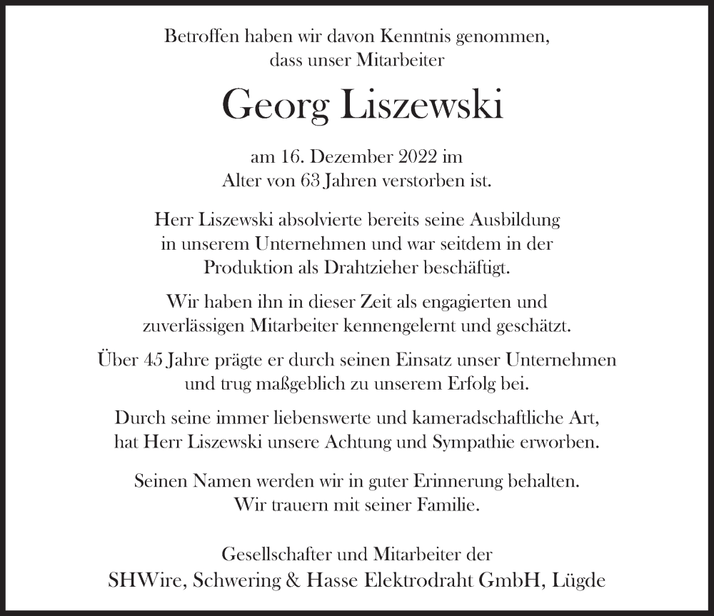 Hier finden Sie alle Traueranzeigen aus der Zeitung, die bisher für Georg Liszewski erschienen sind. Weitere Traueranzeigen, die in der Zeitung erscheinen, werden hier ebenfalls aufgelistet
