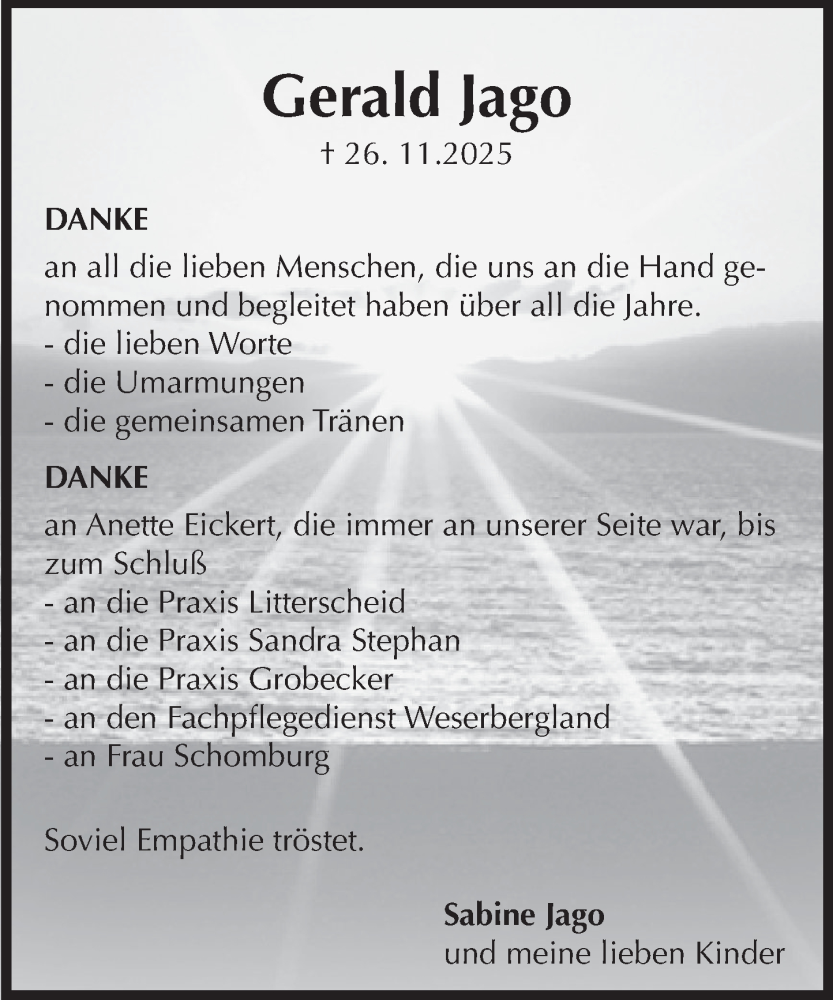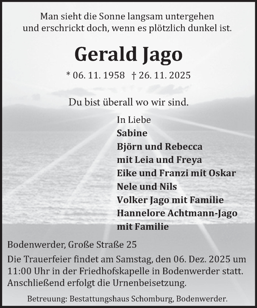 Hier finden Sie alle Traueranzeigen aus der Zeitung, die bisher für Gerald Jago erschienen sind. Weitere Traueranzeigen, die in der Zeitung erscheinen, werden hier ebenfalls aufgelistet