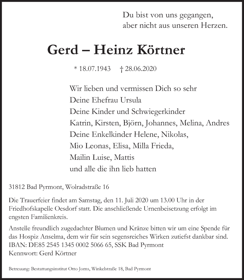 Hier finden Sie alle Traueranzeigen aus der Zeitung, die bisher für Gerd-Heinz Körtner erschienen sind. Weitere Traueranzeigen, die in der Zeitung erscheinen, werden hier ebenfalls aufgelistet