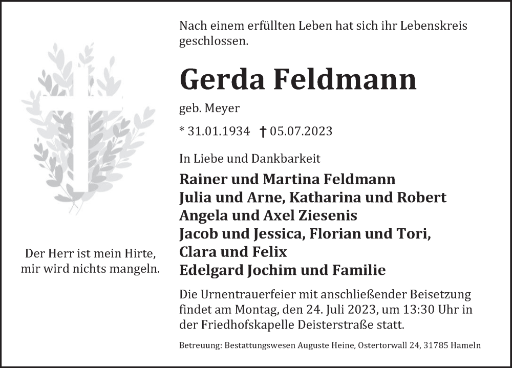 Hier finden Sie alle Traueranzeigen aus der Zeitung, die bisher für Gerda Feldmann erschienen sind. Weitere Traueranzeigen, die in der Zeitung erscheinen, werden hier ebenfalls aufgelistet