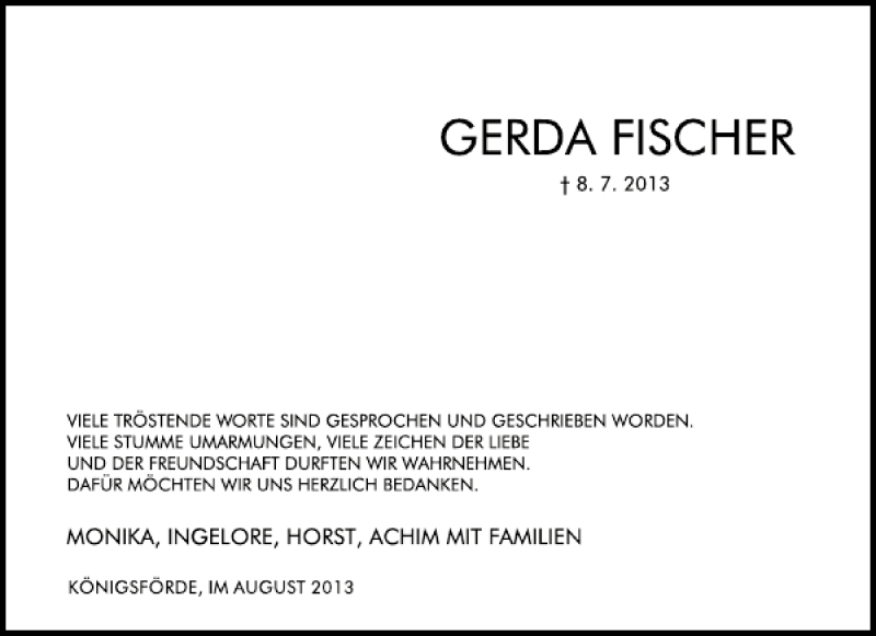 Hier finden Sie alle Traueranzeigen aus der Zeitung, die bisher für Gerda Fischer erschienen sind. Weitere Traueranzeigen, die in der Zeitung erscheinen, werden hier ebenfalls aufgelistet