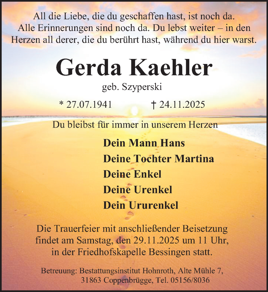 Hier finden Sie alle Traueranzeigen aus der Zeitung, die bisher für Gerda Kaehler erschienen sind. Weitere Traueranzeigen, die in der Zeitung erscheinen, werden hier ebenfalls aufgelistet
