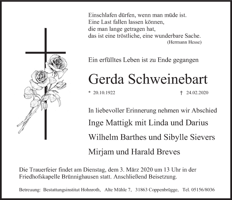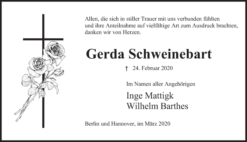 Hier finden Sie alle Traueranzeigen aus der Zeitung, die bisher für Gerda Schweinebart erschienen sind. Weitere Traueranzeigen, die in der Zeitung erscheinen, werden hier ebenfalls aufgelistet