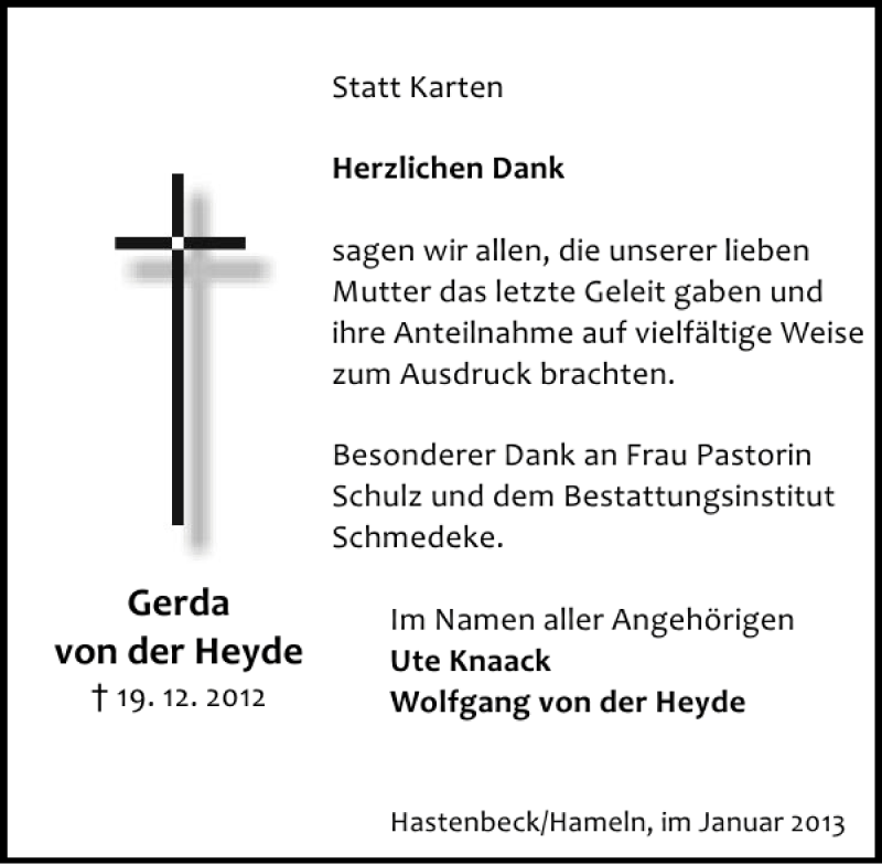 Hier finden Sie alle Traueranzeigen aus der Zeitung, die bisher für Gerda von der Heyde erschienen sind. Weitere Traueranzeigen, die in der Zeitung erscheinen, werden hier ebenfalls aufgelistet