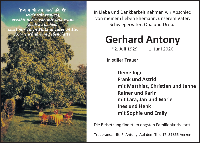 Hier finden Sie alle Traueranzeigen aus der Zeitung, die bisher für Gerhard Antony erschienen sind. Weitere Traueranzeigen, die in der Zeitung erscheinen, werden hier ebenfalls aufgelistet