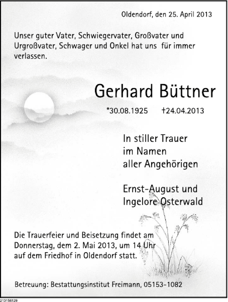 Hier finden Sie alle Traueranzeigen aus der Zeitung, die bisher für Gerhard Büttner erschienen sind. Weitere Traueranzeigen, die in der Zeitung erscheinen, werden hier ebenfalls aufgelistet