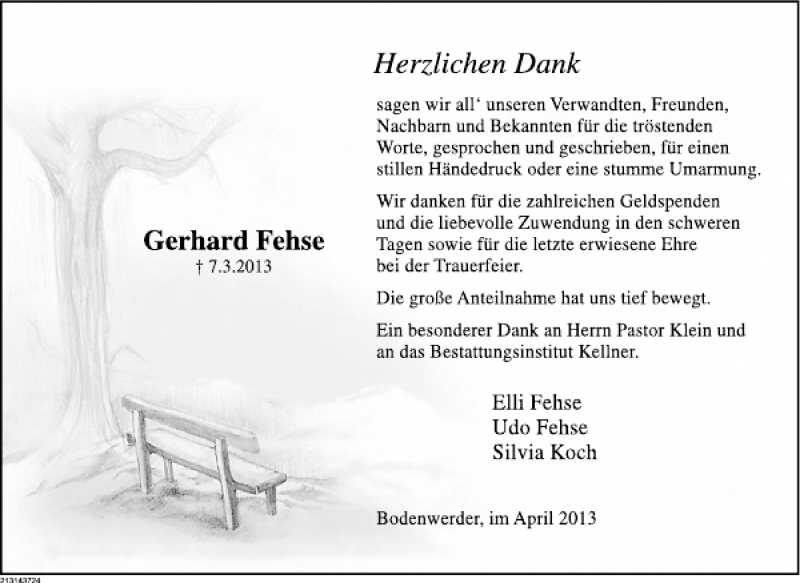 Hier finden Sie alle Traueranzeigen aus der Zeitung, die bisher für Gerhard Fehse erschienen sind. Weitere Traueranzeigen, die in der Zeitung erscheinen, werden hier ebenfalls aufgelistet