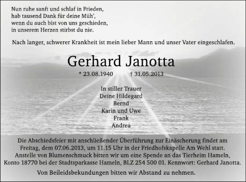Hier finden Sie alle Traueranzeigen aus der Zeitung, die bisher für Gerhard Janotta erschienen sind. Weitere Traueranzeigen, die in der Zeitung erscheinen, werden hier ebenfalls aufgelistet