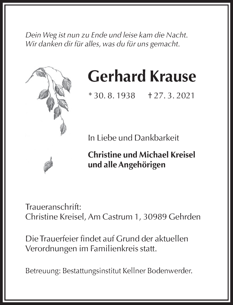 Hier finden Sie alle Traueranzeigen aus der Zeitung, die bisher für Gerhard Krause erschienen sind. Weitere Traueranzeigen, die in der Zeitung erscheinen, werden hier ebenfalls aufgelistet
