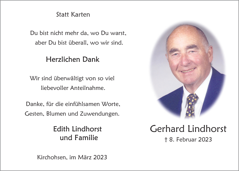 Hier finden Sie alle Traueranzeigen aus der Zeitung, die bisher für Gerhard Lindhorst erschienen sind. Weitere Traueranzeigen, die in der Zeitung erscheinen, werden hier ebenfalls aufgelistet