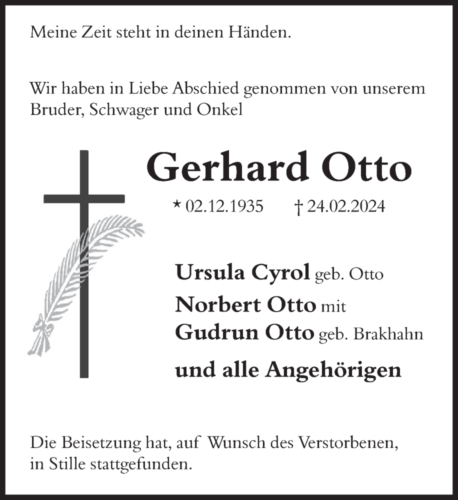 Hier finden Sie alle Traueranzeigen aus der Zeitung, die bisher für Gerhard Otto erschienen sind. Weitere Traueranzeigen, die in der Zeitung erscheinen, werden hier ebenfalls aufgelistet