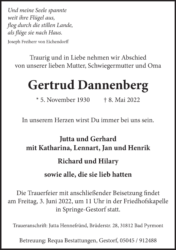 Hier finden Sie alle Traueranzeigen aus der Zeitung, die bisher für Gertrud Dannenberg erschienen sind. Weitere Traueranzeigen, die in der Zeitung erscheinen, werden hier ebenfalls aufgelistet