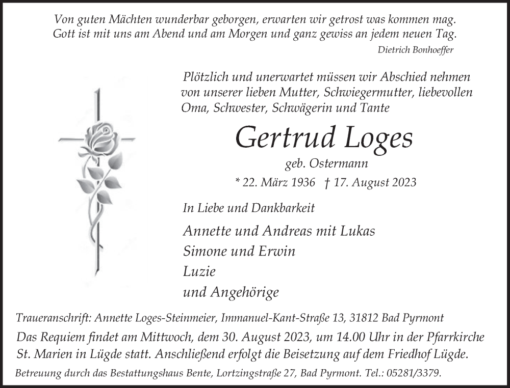Hier finden Sie alle Traueranzeigen aus der Zeitung, die bisher für Gertrud Loges erschienen sind. Weitere Traueranzeigen, die in der Zeitung erscheinen, werden hier ebenfalls aufgelistet