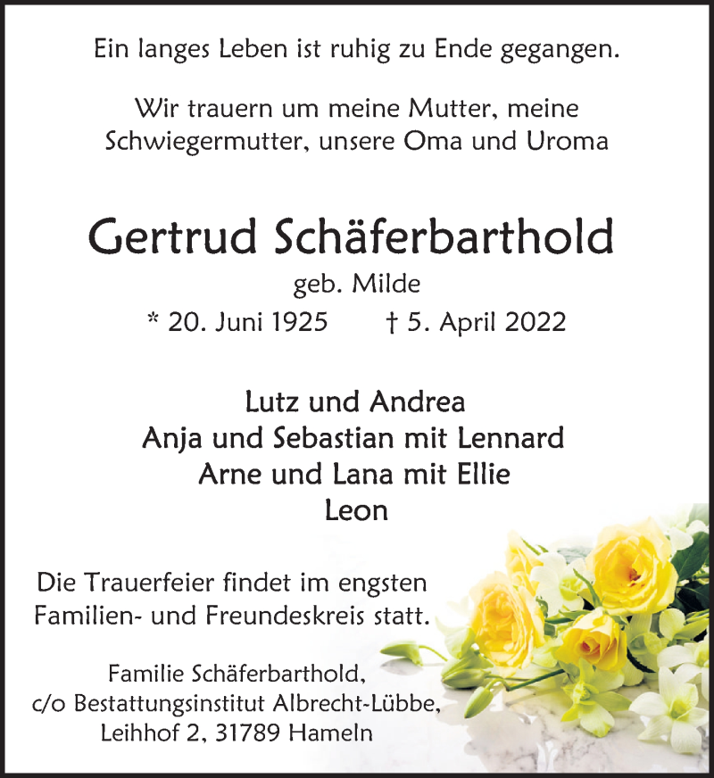 Hier finden Sie alle Traueranzeigen aus der Zeitung, die bisher für Gertrud Schäferbarthold erschienen sind. Weitere Traueranzeigen, die in der Zeitung erscheinen, werden hier ebenfalls aufgelistet