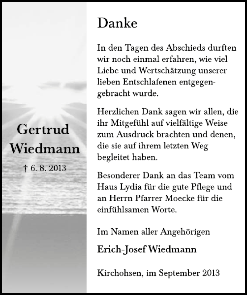 Hier finden Sie alle Traueranzeigen aus der Zeitung, die bisher für Gertrud Wiedmann erschienen sind. Weitere Traueranzeigen, die in der Zeitung erscheinen, werden hier ebenfalls aufgelistet