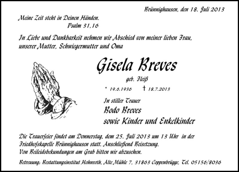 Hier finden Sie alle Traueranzeigen aus der Zeitung, die bisher für Gisela Breves erschienen sind. Weitere Traueranzeigen, die in der Zeitung erscheinen, werden hier ebenfalls aufgelistet