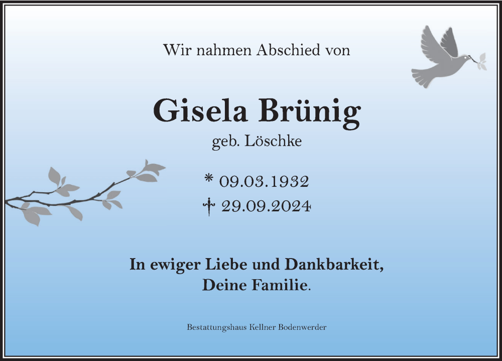 Hier finden Sie alle Traueranzeigen aus der Zeitung, die bisher für Gisela Brünig erschienen sind. Weitere Traueranzeigen, die in der Zeitung erscheinen, werden hier ebenfalls aufgelistet