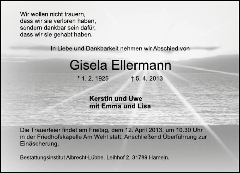 Hier finden Sie alle Traueranzeigen aus der Zeitung, die bisher für Gisela Ellermann erschienen sind. Weitere Traueranzeigen, die in der Zeitung erscheinen, werden hier ebenfalls aufgelistet