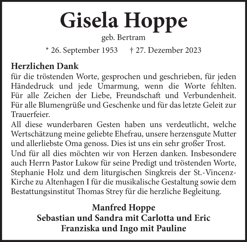 Hier finden Sie alle Traueranzeigen aus der Zeitung, die bisher für Gisela Hoppe erschienen sind. Weitere Traueranzeigen, die in der Zeitung erscheinen, werden hier ebenfalls aufgelistet
