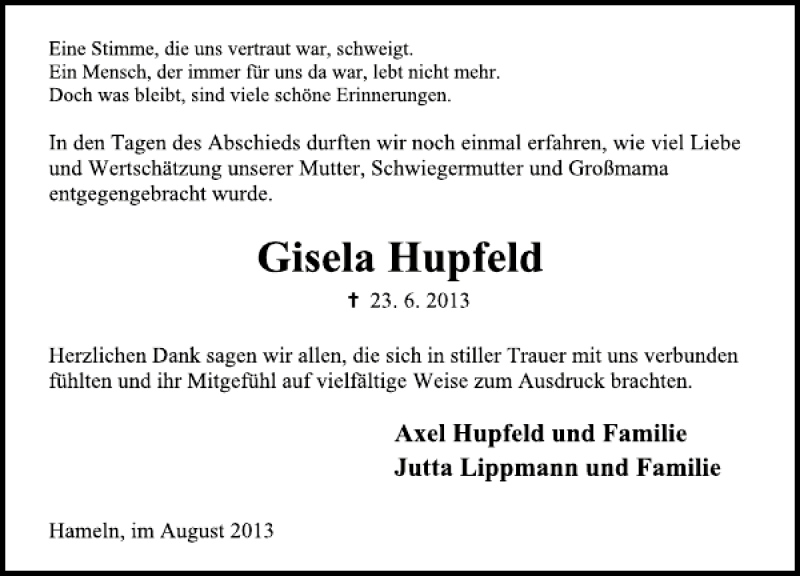 Hier finden Sie alle Traueranzeigen aus der Zeitung, die bisher für Gisela Hupfeld erschienen sind. Weitere Traueranzeigen, die in der Zeitung erscheinen, werden hier ebenfalls aufgelistet