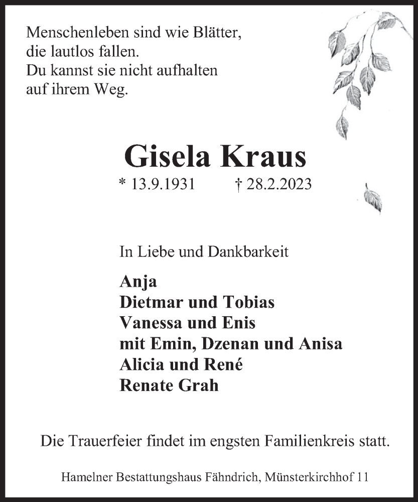Hier finden Sie alle Traueranzeigen aus der Zeitung, die bisher für Gisela Kraus erschienen sind. Weitere Traueranzeigen, die in der Zeitung erscheinen, werden hier ebenfalls aufgelistet