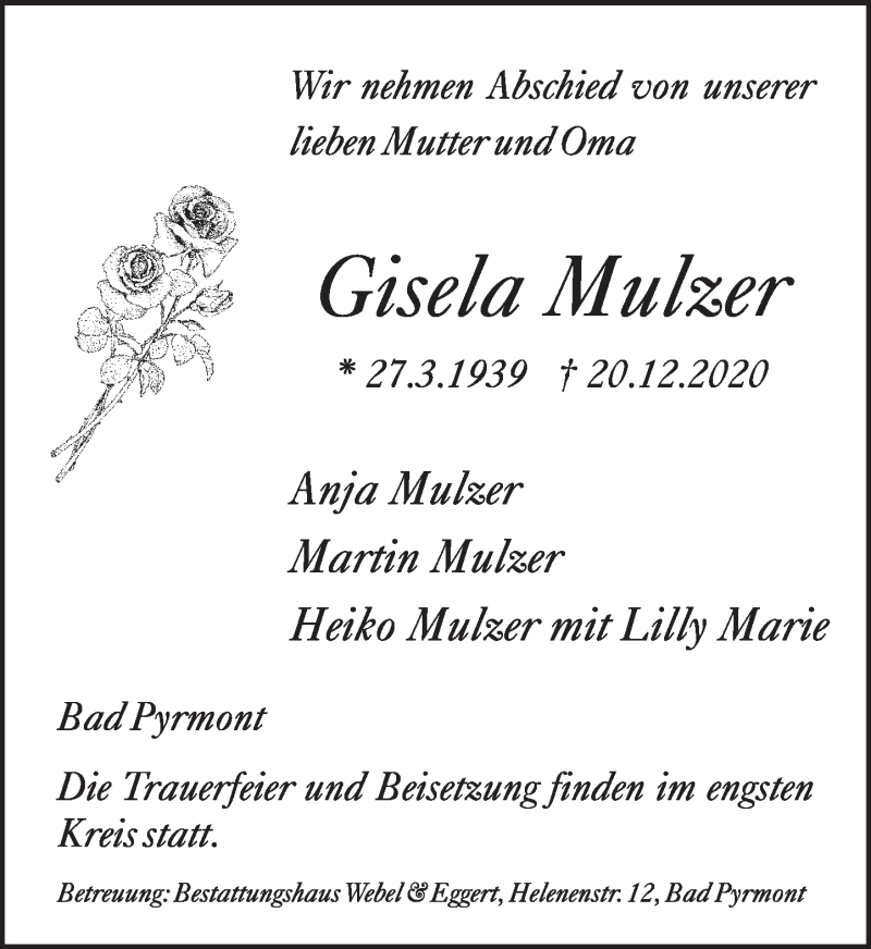Hier finden Sie alle Traueranzeigen aus der Zeitung, die bisher für Gisela Mulzer erschienen sind. Weitere Traueranzeigen, die in der Zeitung erscheinen, werden hier ebenfalls aufgelistet