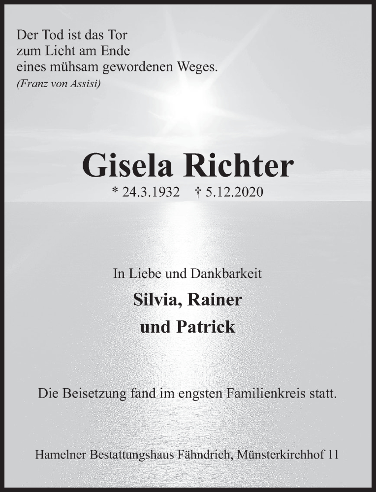 Hier finden Sie alle Traueranzeigen aus der Zeitung, die bisher für Gisela Richter erschienen sind. Weitere Traueranzeigen, die in der Zeitung erscheinen, werden hier ebenfalls aufgelistet