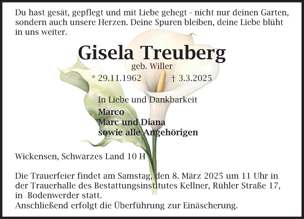 Hier finden Sie alle Traueranzeigen aus der Zeitung, die bisher für Gisela Treuberg erschienen sind. Weitere Traueranzeigen, die in der Zeitung erscheinen, werden hier ebenfalls aufgelistet